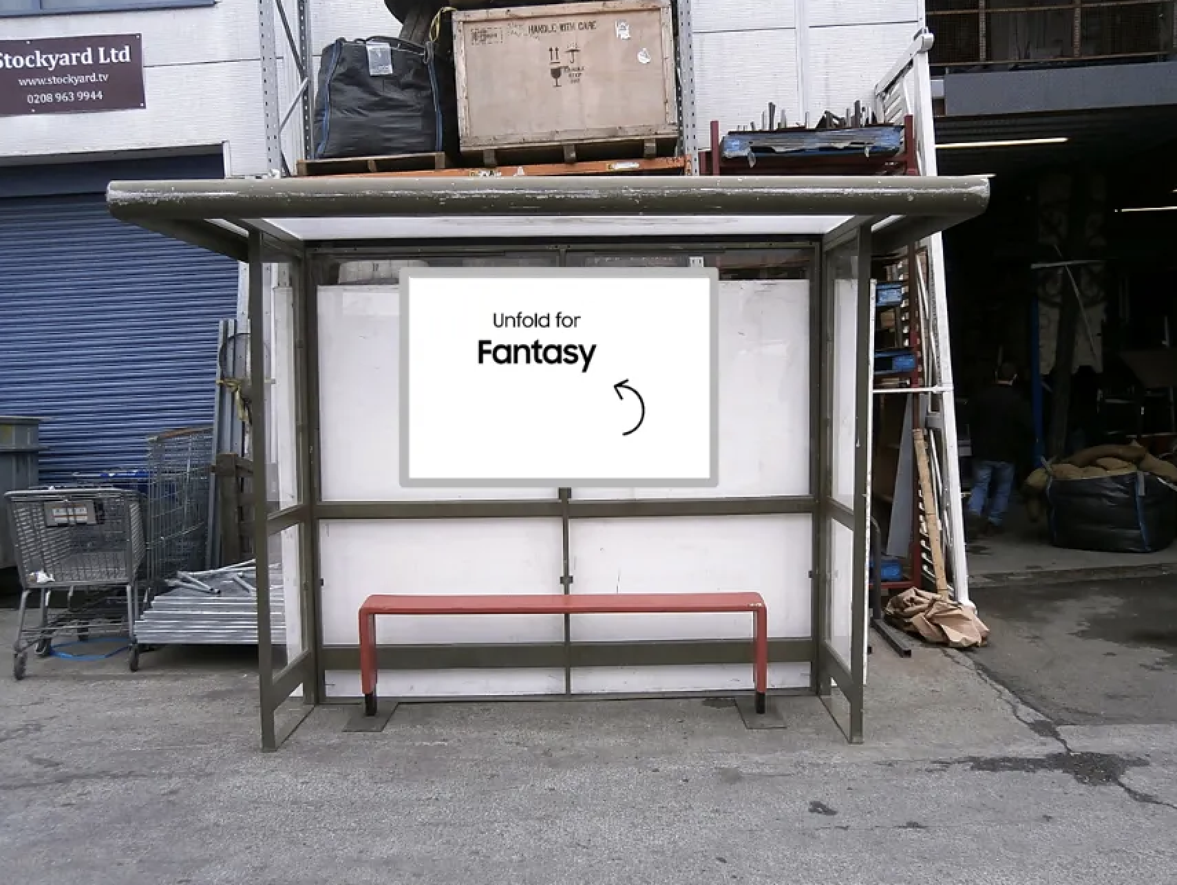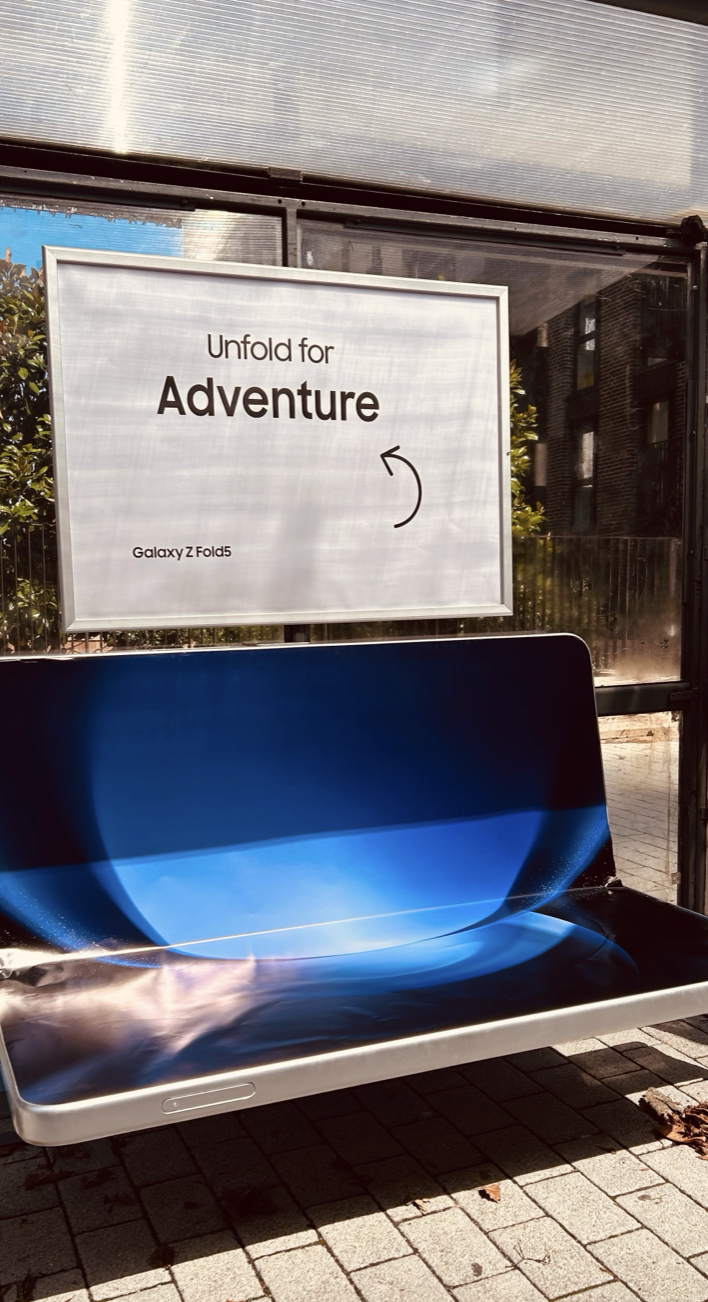We designed a custom-built bus stop featuring a Galaxy Fold-inspired bench. When someone unfolds the oversized Galaxy Fold bench, they activate an immersive adventure or embark on an epic quest, turning a mundane wait into an unforgettable gaming experience.